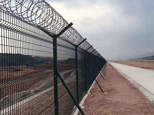 機場圍界又稱作“Y型安全防御護網”,是由V型支架立柱,加強型焊接片網,安全防盜連接件和熱鍍鋅刀片刺籠組成,安全性高、防攀爬能力好
